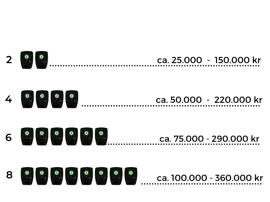 Etableringsprisen varierer afhængigt af installationens størrelse, hvor meget der skal graves, og hvor langt der skal trækkes kabler til ladestanderne. En installation med to ladestandere kan koste alt fra 25.000 til 150.000.